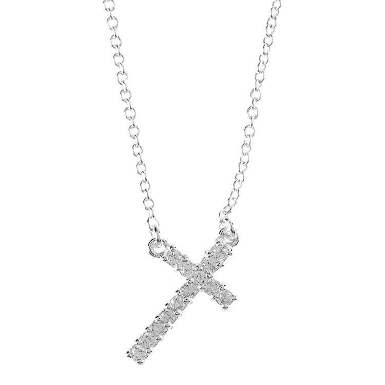 Necklace – Silver Plated Slant Clear Cubic Zirconia Cross