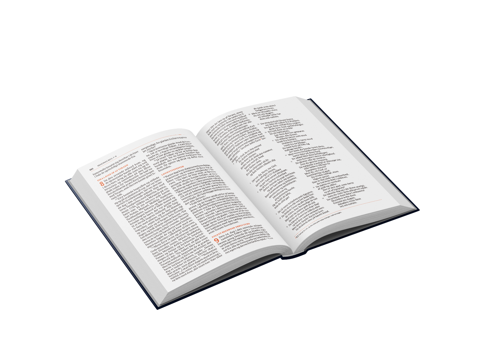 - Designet er udformet med henblik på at optimere læsbarheden. Formatet er større og skrifttypen er meget stor. Teksten er sat op i to spalter per side, hvilket gør tekstlinjerne kortere og nemmere at læse. Der bruges tre forskellige skrifttyper og to forskellige farver, som klart viser, hvad der er tekst, overskrifter og henvisninger.