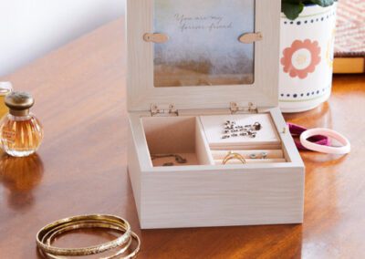 Udskæringen på toppen af dette musikalske smykkeskrin er af to venner vendt mod hinanden, hvilket repræsenterer et varigt og givende venskab, der bringer glæde til giveren og modtageren af denne gave. Trææsken spiller Vivaldis klassisk optimistiske "Forår (La Primavera)". Åbning af det hængslede låg afslører et indlæg med teksten “You are my forever friend". Indlægget kan erstattes af et 8,9 cm stort kvadratisk foto efter eget design. Æsken er foret med blødt stof og aftagelig smykkeindsats.