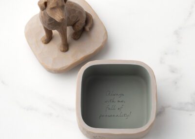 En gave til dem, der elsker hunde og værdsætter deres selskab. Keepsake Boxes er små, søde steder at opbevare smykker, accessories, sedler. Indeni afslører bunden af denne boks den inspirerende tekst, "Always with me, full of personality!" Fås også med en gylden hund.