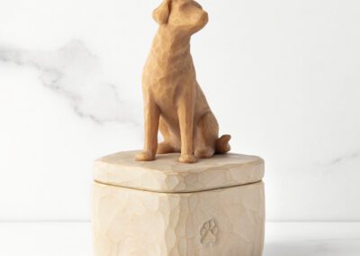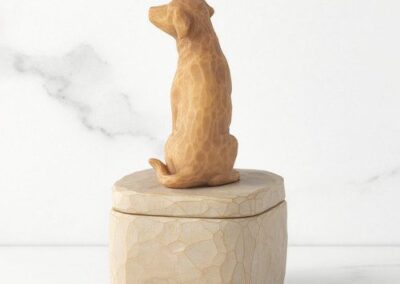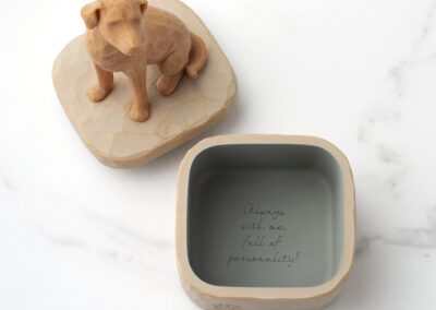 En gave til dem, der elsker hunde og værdsætter deres selskab. Keepsake Boxes er små, søde steder at opbevare smykker, accessories, sedler. Indeni afslører bunden af denne boks den inspirerende tekst, "Always with me, full of personality!" Fås også med en mørkere hund.